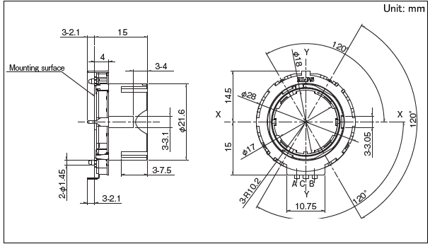 28x29.5x4 28型中空軸裝置 實(shí)現(xiàn)了本體厚度4mm的薄型化和良好的操作感覺。