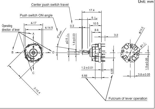 4方向棒式開(kāi)關(guān)(附帶編碼器/中央按鈕功能),1軸/4方向選擇/按動(dòng)輸入/編碼器的節(jié)省空間裝置