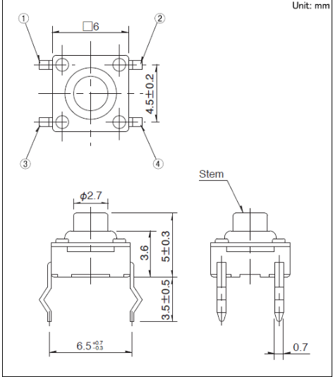 6x6x5mm 6mm方型防塵型(按入式)獨(dú)有的防塵結(jié)構(gòu)和敏感的操作感, 適應(yīng)于電子機(jī)器。