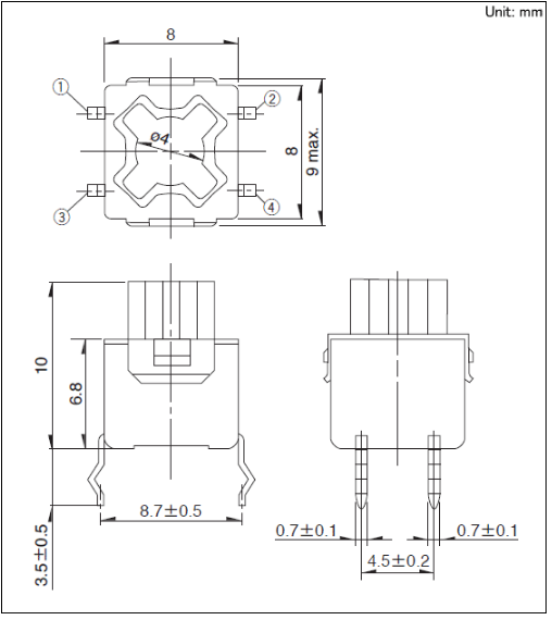 8x9x10mm 8×9mm長行程·重動作力(按入式) 通過行程和重動作力防止誤操作的,8×9mm。