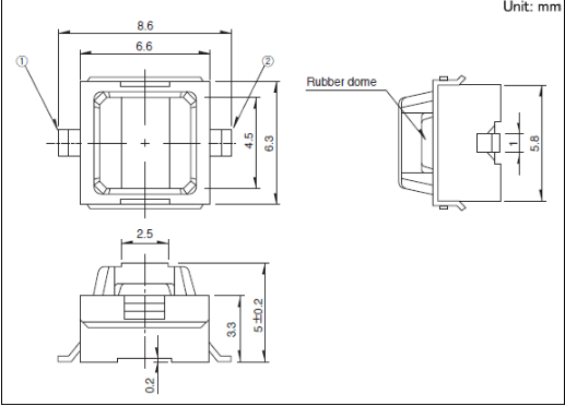6.6x6.3x5mm 6.6×6.3mm重動作力型(表面貼裝) 通過薄型化和重動作力, 最適合于汽車用組件的表面貼裝型?