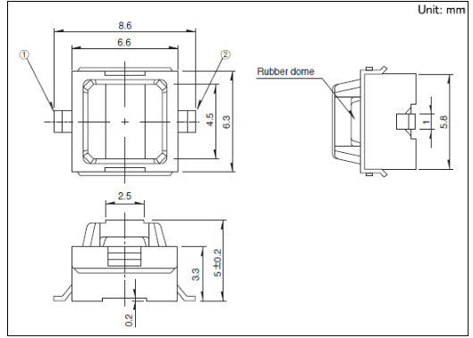 6.6x6.3x5mm 6.6×6.3mm重動作力型(表面貼裝) 通過薄型化和重動作力, 最適合于汽車用組件的表面貼裝型?
