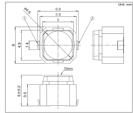 5.9x6x5mm 6.0×5.9mm低接觸電阻型(表面貼裝) 采用金屬接點(diǎn), 實(shí)現(xiàn)了低接觸電阻的柔軟感立式?