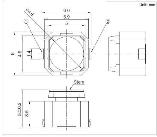 5.9x6x5mm 6.0×5.9mm低接觸電阻型(表面貼裝) 采用金屬接點(diǎn), 實(shí)現(xiàn)了低接觸電阻的柔軟感立式?