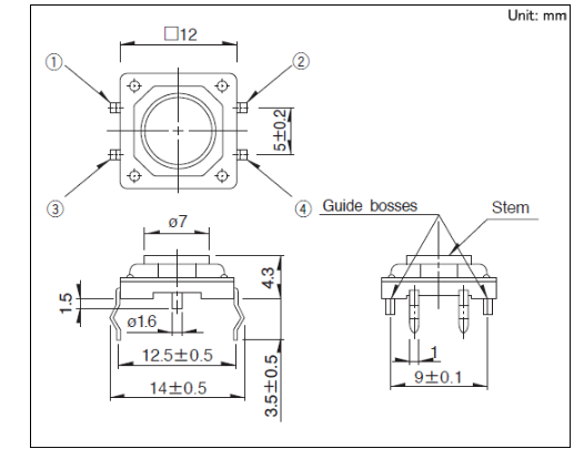 12mm方型長壽命型(按入式) 采用了獨有的防塵結構和高可靠金屬接點的長壽命型。