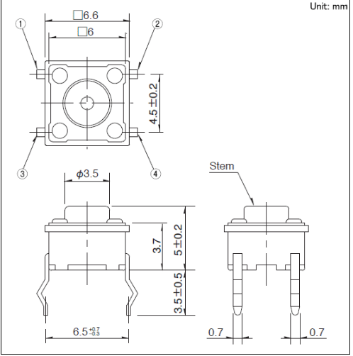 6.6x6.6x5mm 6.6mm方型(按入式) 具有敏感的操作觸感, 通用性杰出的簡(jiǎn)易防塵型。