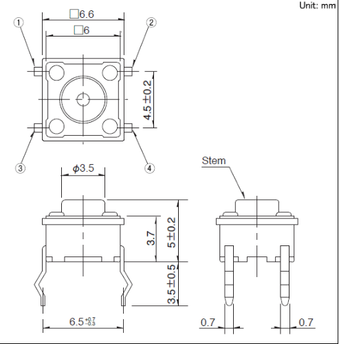 6.6x6.6x5mm 6.6mm方型(按入式) 具有敏感的操作觸感, 通用性杰出的簡易防塵型。