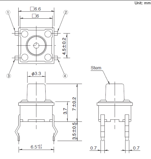 6.6x6.6x7mm 6.6mm方型(按入式) 具有敏感的操作觸感, 通用性杰出的簡易防塵型。