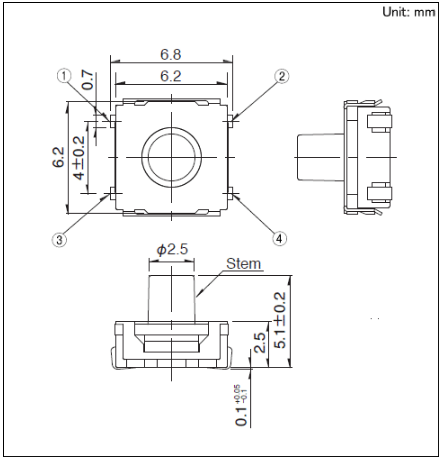 6.2x6.2x5.1mm 6.2mm方型中行程型(表面貼裝) 由于采用了橡膠按鈕, 實(shí)現(xiàn)了0.3?0.55mm的超行程?