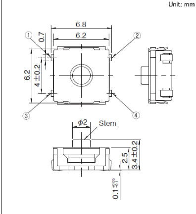 6.2x6.2x3.4mm 6.2mm方型中行程型(表面貼裝) 由于采用了橡膠按鈕, 實(shí)現(xiàn)了0.3?0.55mm的超行程?