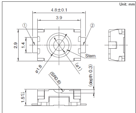 3.9x2.9x1.5mm 3.9×2.9mm小型(表面貼裝) 為組合部件的小型, 薄型化做出貢獻的, 按鈕高度1.5mm & 2mm型?