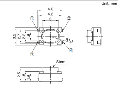 4.2x3.2x2.5mm 4.2×3.2mm小型重動(dòng)作力(表面貼裝) 適合于汽車用需要的重動(dòng)作力, 按鈕面積大貼裝性能優(yōu)良?