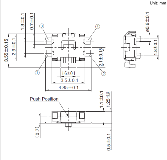 3.5x3.55x1.25mm 3.5×3.55mm薄型Side Push型(表面貼裝) 實現(xiàn)較高的焊接強度和小型化、薄型化(1.25mm)。