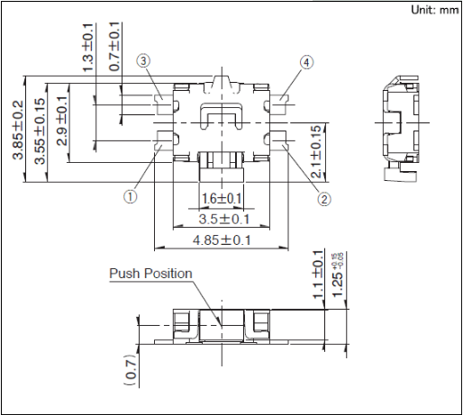 3.5x3.55x1.25mm 3.5×3.55mm薄型Side Push型(表面貼裝) 實(shí)現(xiàn)較高的焊接強(qiáng)度和小型化、薄型化(1.25mm)。