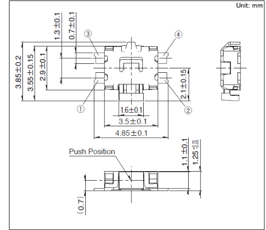 3.5x3.55x1.25mm 3.5×3.55mm薄型Side Push型(表面貼裝) 實(shí)現(xiàn)較高的焊接強(qiáng)度和小型化、薄型化(1.25mm)。