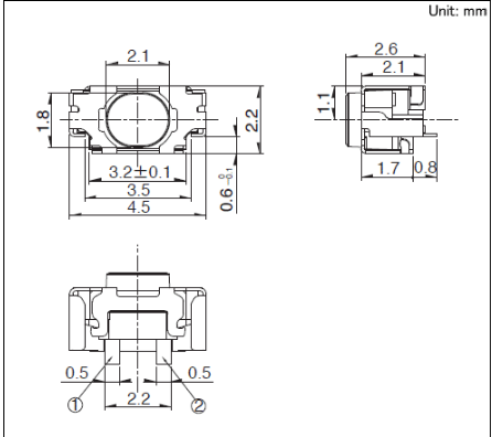 4.5x2.6x2.2mm 4.5×2.6mm Side Push半貼裝式(表面貼裝) 基板表面安裝高度為1.6mm的半貼裝式。