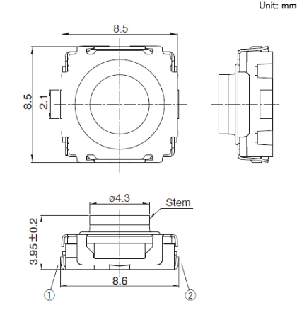 8.5x8.5x3.95mm 8.5mm方型中等行程的型(表面貼裝)實現(xiàn)了具有良好品味的操作觸感的0.9mm行程型。