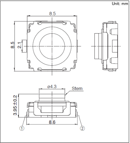 8.5x8.5x3.95mm 8.5mm方型中等行程的型(表面貼裝)實(shí)現(xiàn)了具有良好品味的操作觸感的0.9mm行程型。