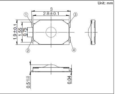 2.8x1.9x0.55mm 2.8×1.9mm小型、附帶凸起的型(表面貼裝) 為提高組合部件的薄型化、貼裝效率做出了貢獻的本體寬度1.9mm型。