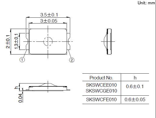 3x2x0.6mm 3.0×2.0mm小型、附帶凸起的型(表面貼裝) 為組合部件的薄型化做出了貢獻(xiàn)的開(kāi)關(guān)本體寬度2mm小型。