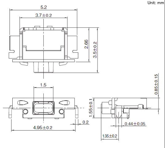3.7x3.5x0.85mm 3.7×3.5mm Side Push半貼裝式(表面貼裝) 基板面的安裝高度為0.85mm的半貼裝型。