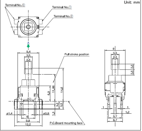 9.4x9x6.9mm 1.5mm行程立式 實現無鉛焊接表面貼裝的按動開關。