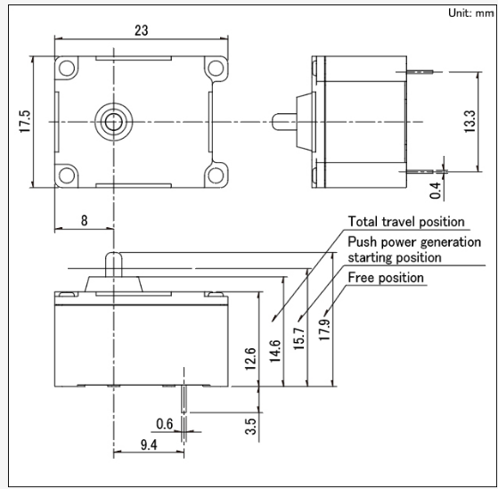 17.5×23×17.9mm無需電源和電池,免于維護保養(yǎng)。通過按壓等輕動作力即可發(fā)電。
