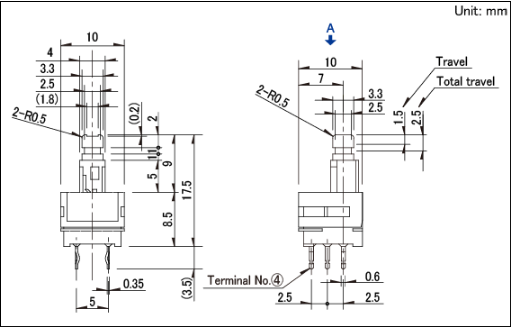 10x10x8.5mm 1.5mm行程立式 具有兩種旋鈕形狀的立式。
