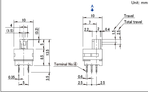 10x10x8.5mm 1.5mm行程立式 具有兩種旋鈕形狀的立式。