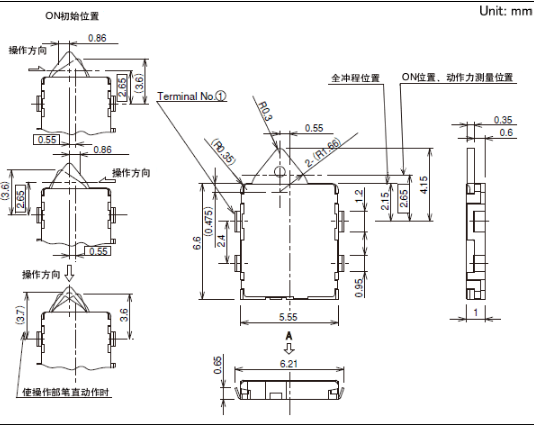 5.55x6.6x1mm 薄型3方向動(dòng)作型 SPVL系列實(shí)現(xiàn)180°自由動(dòng)作, 本體厚1mm。