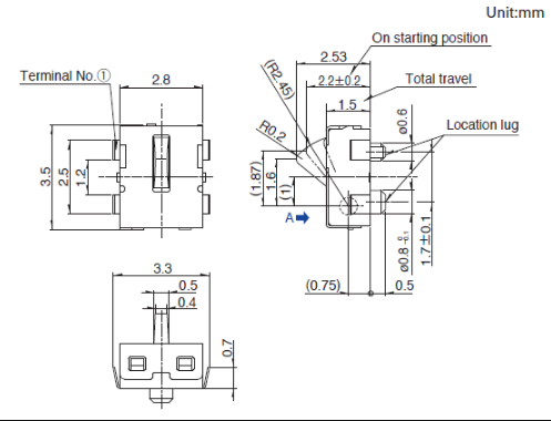 2.8x3.5x1.5mm 小型雙向動作型 能從縱·橫兩方向按動,節(jié)省空間3.5×2.8×1.5mm型。