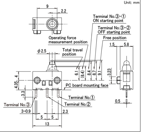 13x5.8x8.35mm 防水型 無驅(qū)動(dòng)機(jī)構(gòu),可斜壓的長(zhǎng)行程型。