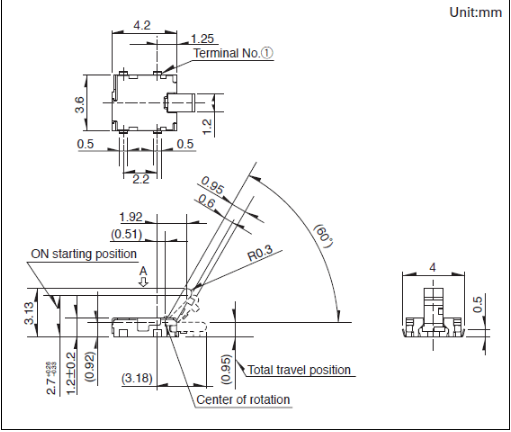 3.6x4.2x1.2mm 薄型控制桿型 高1.2mm的薄型,長(zhǎng)行程型。