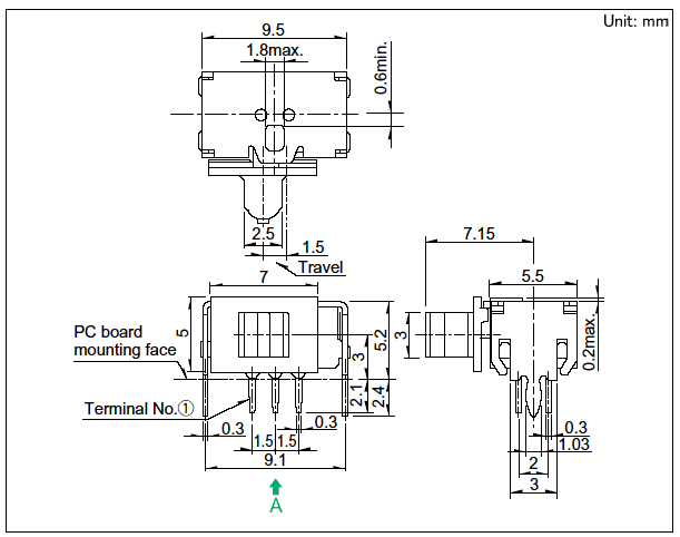 1.5mm行程外表按鍵型 行程1.5mm,外表型按鍵橫型。