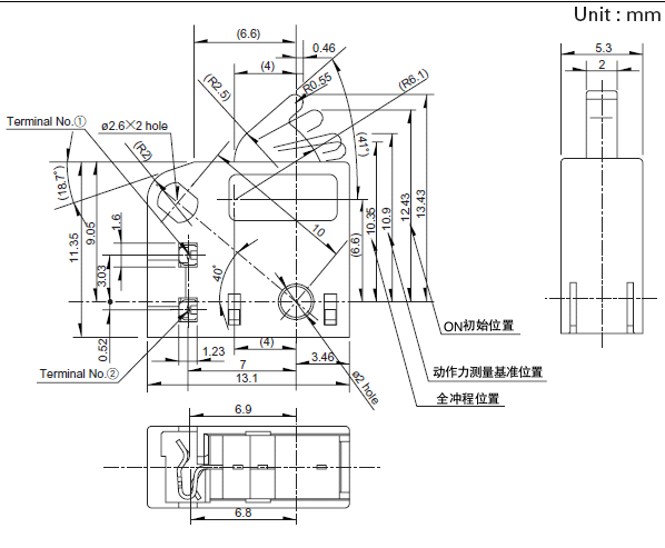 13.1x11.35x5.3mm 帶套筒連接器端子的雙向動作型 用接頭連接,無需焊接。