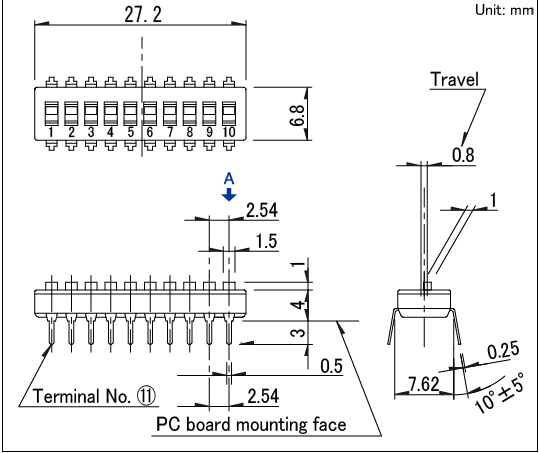 對應2~10電路的 實現(xiàn)金接點的高可靠性, 與IC相同形狀可自動插入。