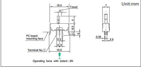 最大額定/最小額定(電阻負(fù)載) 0.1A 30V DC/50μA 3V DC,接觸電阻(初期/壽命后) 25mΩ max./65mΩ max.,無負(fù)載壽命 10,000 cycles 45mΩ max.負(fù)載壽命(最大額定負(fù)載) 10,000 cycles 65mΩ max.操作部長度: 6mm,電路數(shù)